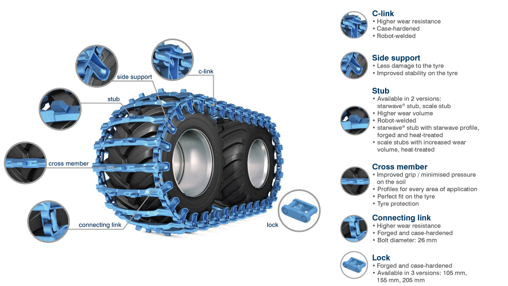 Díky inovativnímu profilu pewag starwave® a asymetrickému uspořádání čepů se značně zvyšuje trakce. Nezávisle na vlastnostech půdy zabírají asymetricky uspořádané čepy spolehlivě do terénu. Dále nabízejí individuální profily příčníků pro všechny podklady zesílenou oporu a zvyšují prostupnost terénu, a to i při eventuálním nadměrném naložení stroje.
